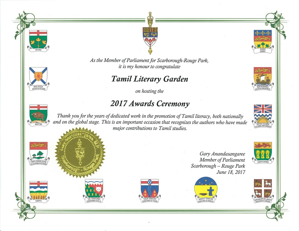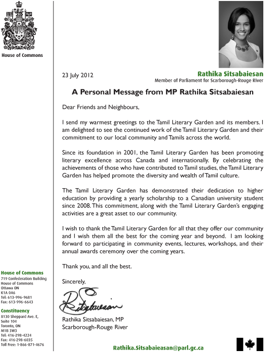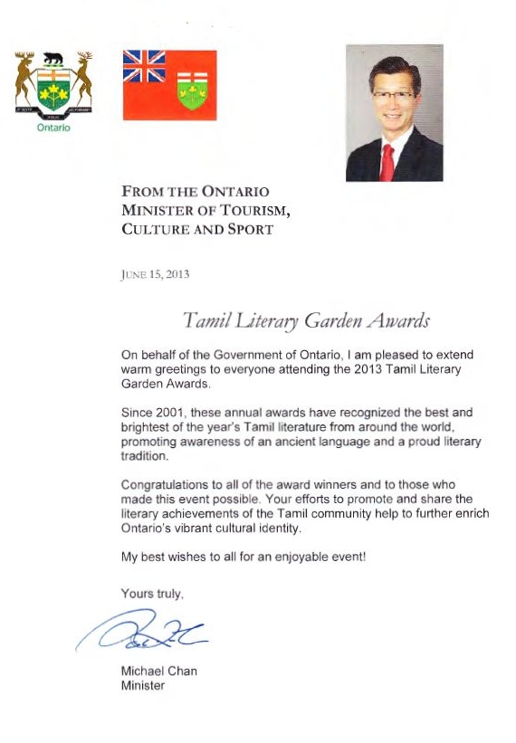 “I am pleased to extend my warmest greetings to Tamil Literary Garden. The bilingual book “In Our Translated World”, which was produced thanks to a grant from the Ontario Trillium Foundation, was launched on March 9, 2014 in Toronto. The event was a great success and I thank the organisers for their hard work and dedication.”